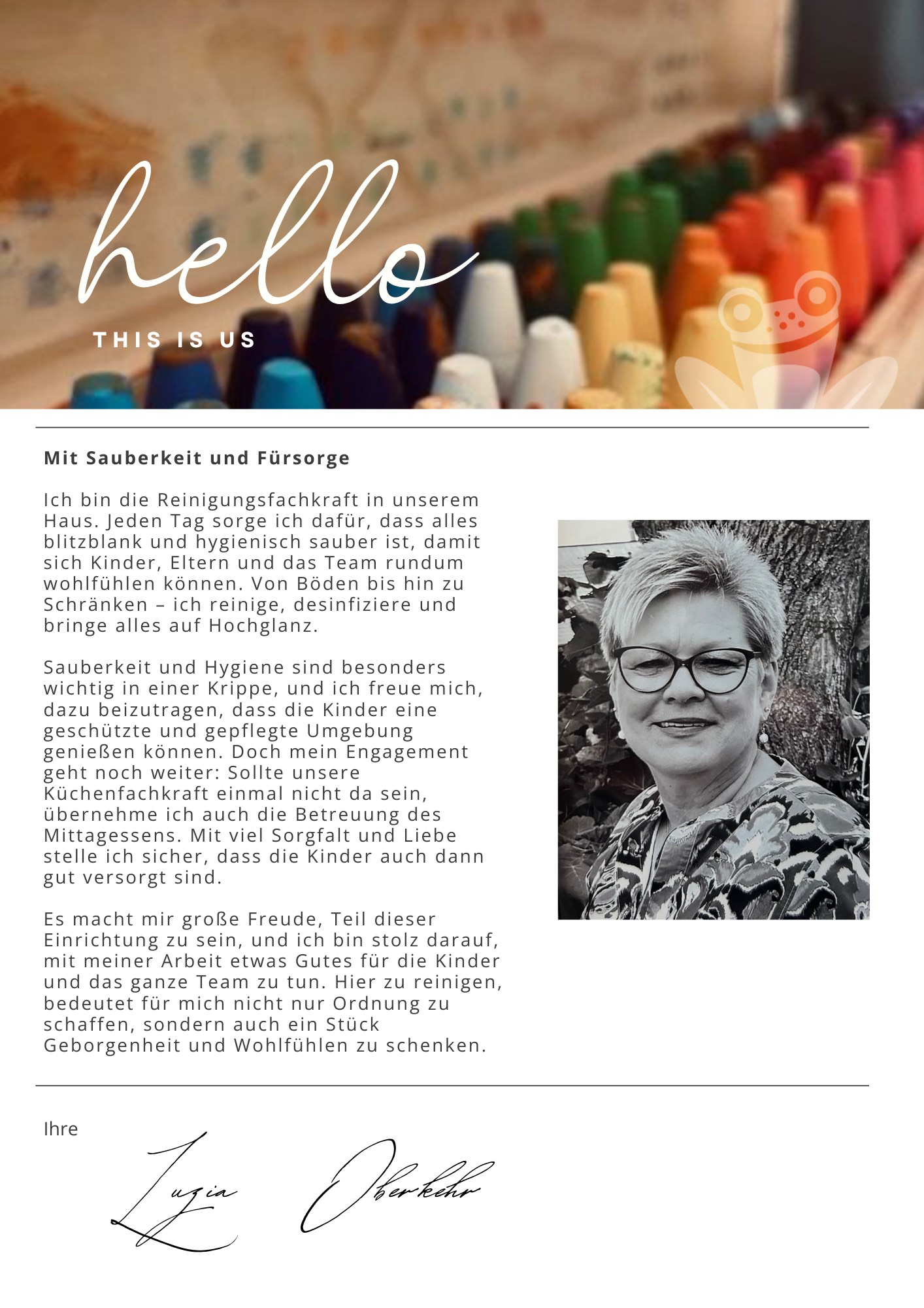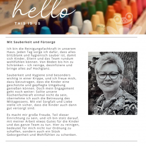 Hier erfahren Sie mehr über unser engagiertes und herzliches Team. Jede Mitarbeiterin und jeder Mitarbeiter bringt individuelle Fähigkeiten, viel Erfahrung und vor allem Expertise und Freude an der Arbeit mit den Kleinsten mit. Gemeinsam schaffen wir eine Umgebung, in der sich Ihr Kind wohlfühlt, wachsen und spielerisch die Welt entdecken kann. Dabei besteht unser Team aus vielen leidenschaftlichen Pädagogen, die alle ein Ziel teilen: das Beste für Ihr Kind!